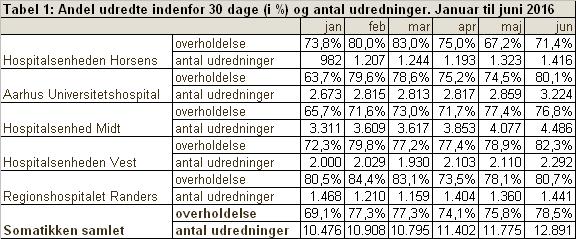 Overholdelsen af de gældende behandlingsfrister ligger i 1. halvår 2016 omkring 80 % i Region Midtjylland. Hvis behandlingsfristen i denne periode havde været en måned for alle patienter, ville overholdelsen have været omkring 60-65 %. Der er således behov for opmærksomhed på at forbedre overholdelsen af behandlingsfristerne. Hospitalerne i Region Midtjylland har de seneste måneder forberedt overgangen til en måneds behandlingsfrist, blandt andet ved at afvikle ventelister.