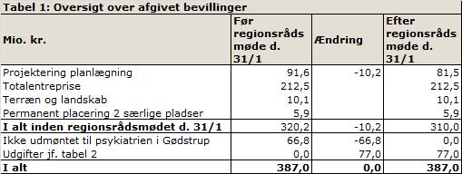 Nedenstående tabel 1 viser det samlede anlægsbudget for etablering af de 32 særlige pladser i Region Midtjylland.