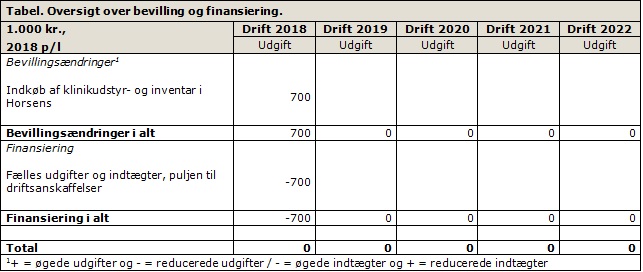 Tabel 1 viser, hvilke bevillinger der allerede er afgivet og budget for de tilbageværende poster; herunder at der allerede er bevilget 0,8 mio. kr. til projektet i Randers og således tilbagestår 18,2 mio. kr. til etablering af ambulatorium samt 2,3 mio. kr. til erhvervelse af Østervangsvej 28 for at dække det samlede budget på 21,3 mio. kr. jf. ovenfor beskrevne mulighed 1.