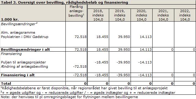 Nedenstående tabel 2 viser, at der gives tre separate anlægsbevillinger; en på 3,45 mio. kr. til at afholde udgifter ved indretning af sengeafsnit i Regionspsykiatrien Randers, en på 2,3 mio. kr. som maksimal ramme for en tillægsbetaling ved indgåelse af aftale om mageskifte med bygningerne Østervangsvej 28 og Østervangsvej 32-36 samt Østervangsvej 72 og dertil knyttede handelsomkostninger - samt endeligt en bevilling til indretning af to midlertidige pladser i Nyt psykiatrisk Center i Skejby på 1,0 mio. kr. De to midlertidige pladser skal i perioden, indtil Gødstrup kan ibrugtages, sammen med de 14 midlertidige pladser i Regionspsykiatrien Midt anvise de forudsatte 16 pladser. Dermed kan der sammen med de 16 permanente pladser i Nyt Psykiatrisk Center i Skejby anvises i alt 32 pladser.