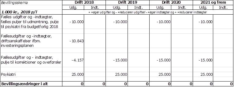 | at | løftet af psykiatrien på 15 mio. kr. fra konstitueringsaftalen for regionsrådet i 2018 finansieres ved en reduktion af driftsanskaffelser i investeringsplanen og en negativ pulje til forventet mindreforbrug i 2018, |