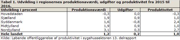 Hospitalsenheden Horsens og Regionshospitalet Randers, som i de senest år har haft en meget høj produktivitet, har begge en negativ produktivitetsudvikling fra 2015 til 2016. Begge hospitaler ligger stadig godt over landsgennemsnittet med indeks 107 og 108. Hospitalsenheden Vest og Hospitalsenhed Midt har begge en positiv produktivitetsudvikling over landsgennemsnittet og har dermed et højere produktionsniveau end i 2015. Aarhus Universitetshospital har en positiv produktivitet på 0,5 %, hvilket er bedre end i 2015, hvor den var -0,4. Det er dog stadig under landsgennemsnittet, hvorfor produktivitetsniveauet falder til indeks 93.
