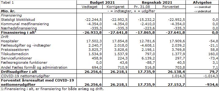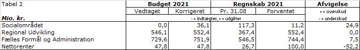 På indikatoren Forventet årsresultat, fremgår det, at der forventes et resultat for 2021 på 24,9 mio. kr. inklusiv akkumuleret overskud fra 2020 på 36,1 mio. kr. Efterspørgslen har været stigende i 2. kvartal af 2021. Resultatet betyder, at der isoleret set er et forventet merforbrug på 11,2 mio. kr. i 2021, hvilket har været intentionen, idet socialområdet ikke bør akkumulere alt for stort overskud af midler, som stammer fra takstindtægter fra kommunerne. Socialområdet har i 2021 derfor styret efter at bringe midler i anvendelse til gavn for kvaliteten af de tilbud, som regionen driver efter aftale med kommunerne. Socialområdets forventede driftsbudget er 1,3 mia. kr., så et forventet overskud på 24,9 mio. kr. udgør under 2 % af socialområdets samlede drift.
