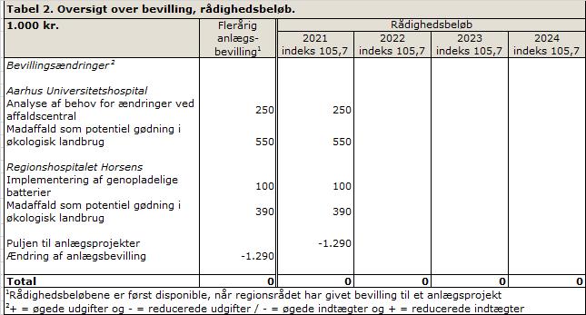 Hvis ovenstående forslag godkendes, er der et resterende mindreforbrug på projektpuljen på 2,0 mio. kr.. Midlerne udmøntes sammen med forventet mindreforbrug på øvrige bevillinger under Regional Udvikling i forbindelse med økonomirapporteringen pr. 31. august 2021, hvor de foreslås udmøntet til testhuset i Roslev under bevillingen jordforurening og til afskrivning af debitorer under bevillingen kollektiv trafik. Økonomirapporteringen pr. 31. august 2021 behandles på regionsrådets møde den 27. oktober 2021.